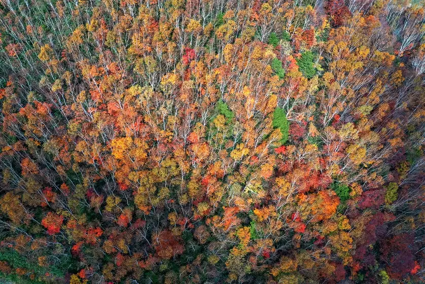 秋の志賀高原一の瀬エリアは、山々と高原が鮮やかな紅葉に彩られる、特に人気の高い季節です。赤や黄、橙に染まる木々が広がり、澄みきった青空とのコントラストが美しい景観を生み出します。標高差のある志賀高原ならではの移ろいにより、時期や場所によって異なる紅葉の表情を楽しめるのも魅力です。空気はひんやりと心地よく、散策や写真撮影にも最適。静かな森の中で落ち葉を踏みしめながら歩く時間には、高原の秋ならではの奥行きある風情と、自然の豊かさが感じられます。