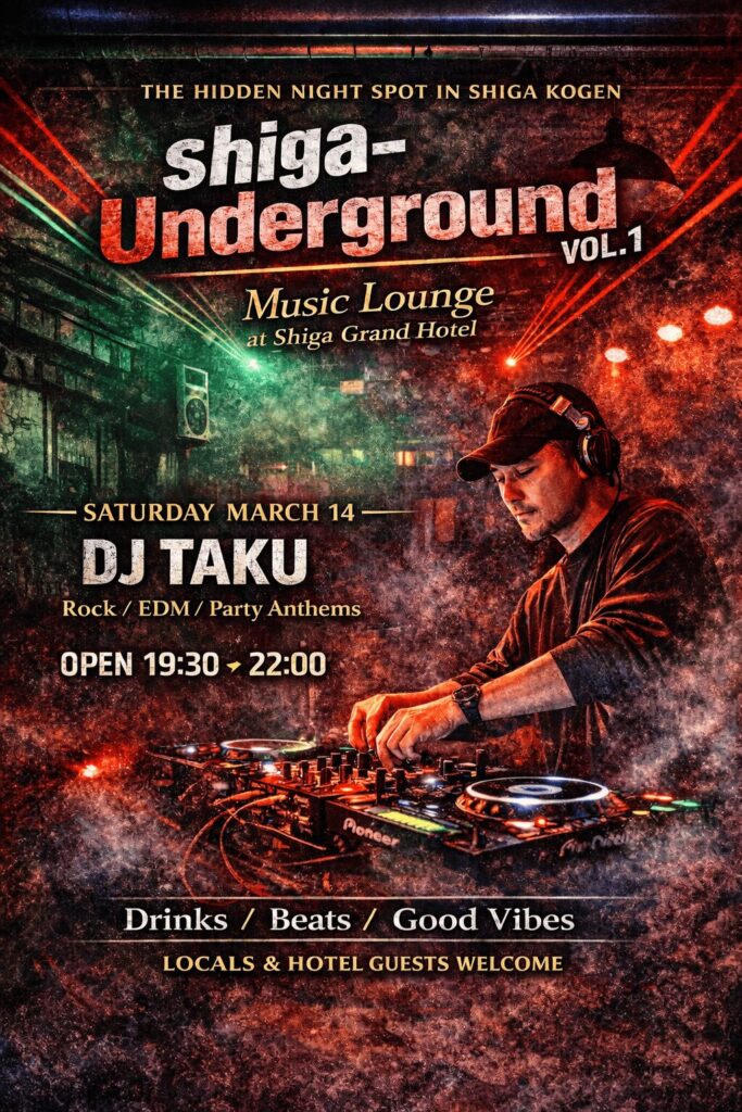 2026年3月14日(土)、志賀高原一の瀬エリア、志賀グランドホテル地下にてMusic Lounge Shiga-Undergraoud vol.1の開催いたします!