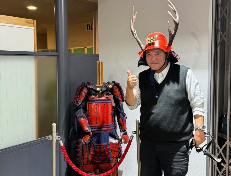 兜は高相社長が自ら兜職人に依頼しに行ったこだわりの一品。